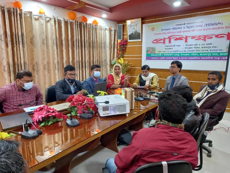 স্থানীয় সরকার বিভাগ ও জাইকার (JICA) আর্থিক সহায়তায় জামালপুর সদর উপজেলায় বাস্তবায়নাধীন উপজেলা পরিচালন ও উন্নয়ন প্রকল্প (ইউজিডিপি) এর সক্ষমতা উন্নয়ন প্রকল্প (৫ম পর্যায়) উপপ্রকল্প "উপজেলার বিভিন্ন ইউনিয়নের আগ্রহী কৃষকদের কফি চাষের কলাকৌশল বিষয়ক প্রশিক্ষণ" এর ৩ দিন ব্যাপি ১ম ব্যাচটি ০৬ জানুয়ারী-২০২২ খ্রি. তারিখে উদ্ধোধন করা হয়। এসময় উপস্থিত ছিলেন উপজেলা পরিষদের সম্মানীত চেয়ারম্যান জনাব মোহাম্মদ আবুল হোসেন, উপজেলা নির্বাহী অফিসার জনাব লিটুস লরেন্স চিরান, মহিলা ভাইস চেয়ারম্যান জনাব ফারজানা ইয়াসমিন লিটা, জেলা বীজ প্রত্যয়ন অফিসার জনাব সাইফুল ইসলাম আজম খান, কৃষি সম্প্রসারণ কর্মকর্তা জনাব সাইফুল ইসলাম, ইউডিএফ জনাব আশরাফুল আলম এবং বিভিন্ন ইউনিয়নের কৃষকবৃন্দ।