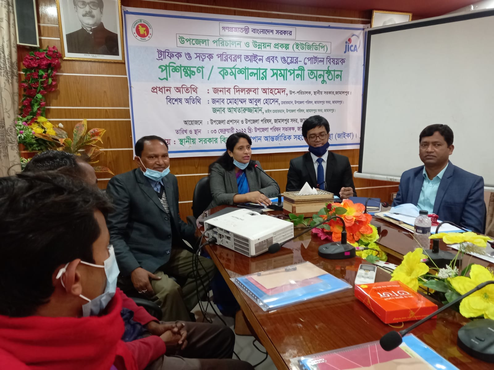 জামালপুর সদর উপজেলা পরিষদ সভাকক্ষে স্থানীয় সরকার বিভাগ ও জাইকার আর্থিক সহযোগিতায় ইউজিডিপি'র আওতায় সক্ষমতা উন্নয়ন প্রকল্প (৫ম পর্যায়) এর প্রকল্প" ট্রাফিক ও সড়ক পরিবহন আইন বিষয়ক প্রশিক্ষণ কর্মশালায় সমাপনী অনুষ্ঠানে বক্তব্য প্রদান করেন জনাব দিলরুবা আহমেদ মহোদয়, উপ-পরিচালক, স্থানীয় সরকার, জামালপুর। অন্যান্যদের মধ্যে উপস্থিত আছেন জনাব লিটুস লরেন্স চিরান মহোদয়, উপজেলা নির্বাহী অফিসার, জামালপুর সদর, জনাব আখতারুজ্জামান, ভাইস চেয়ারম্যান, উপজেলা পরিষদ, জামালপুর সদর ও জনাব মোঃ আশরাফুল আলম, ইউডিএফ প্রমূখ।
