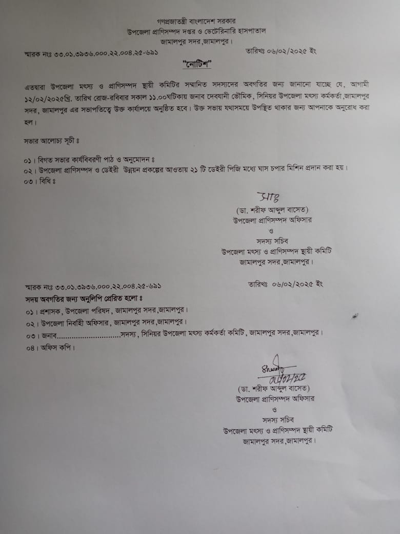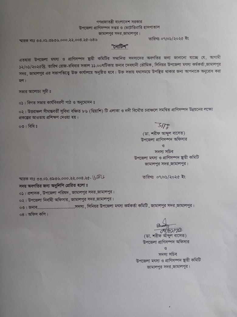 উপজেলা মৎস্য ও প্রাণিসম্পদ কমিটি সভার নোটিশ ও কার্যবিবরণী